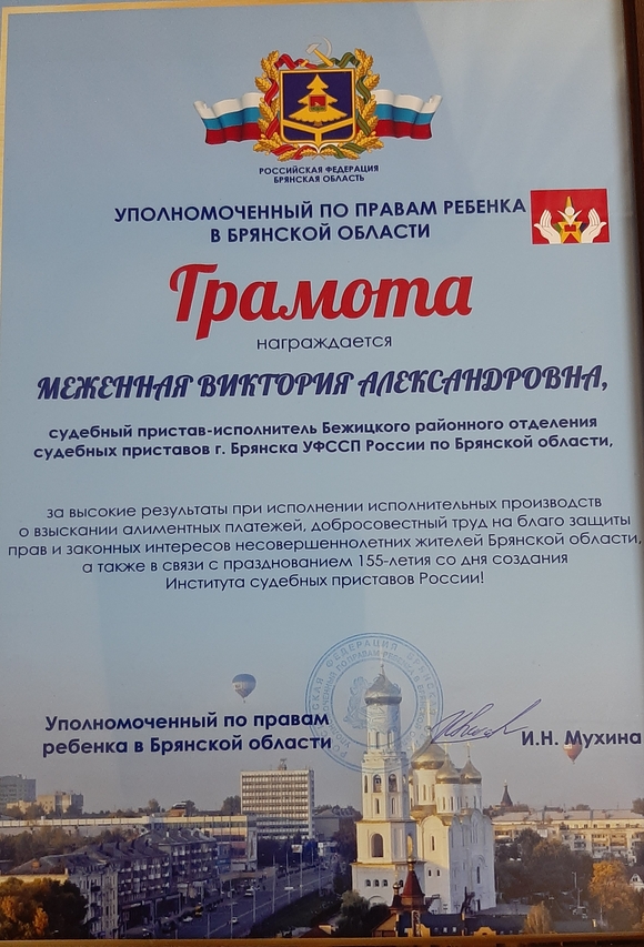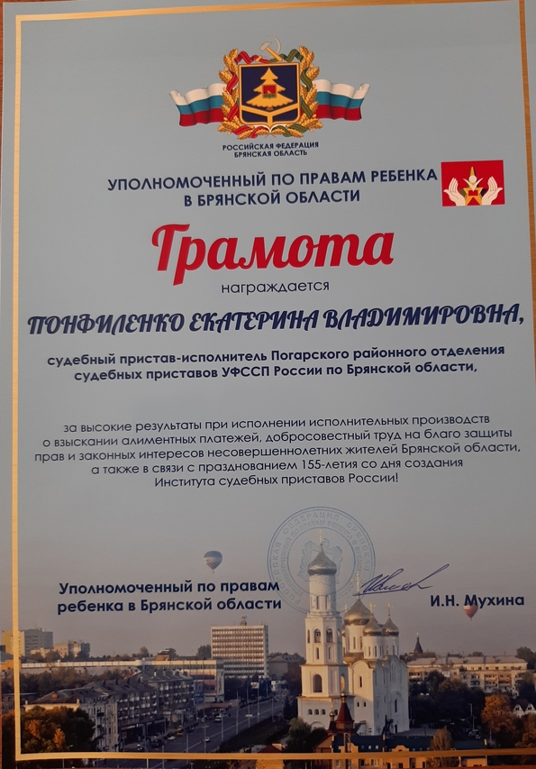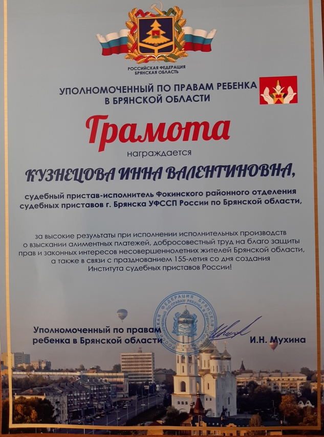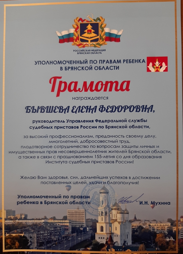 Выражаем слова глубокой признательности и благодарности всем сотрудникам УФССП России по Брянской области за добросовестный труд, тесное сотрудничество в вопросах защиты прав и охраняемых законом интересов детей Брянской области!