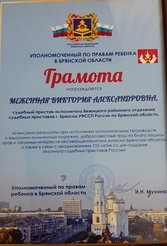 Продолжается тесное сотрудничество службы судебных приставов с уполномоченным по правам ребенка: розыск детей, исполнение судебных решений в интересах детей (определение места жительства ребенка, порядка общения с одним из родителей, обеспечение имущественных и жилищных прав и др.). Грамотами Уполномоченного по правам ребенка в Брянской области отмечены: руководитель УФССП России по Брянской области, главный судебный пристав Брянской области Е.Ф.Бывшева, судебный пристав-исполнитель Фокинского районного отделения судебных приставов г. Брянска УФССП России по Брянской области И.В.Кузнецова; судебный пристав-исполнитель Бежицкого районного отделения судебных приставов г. Брянска УФССП России по Брянской области В.А.Меженная; судебный пристав-исполнитель Погарского районного отделения судебных приставов УФССП России по Брянской области Е.В.Понфиленко.