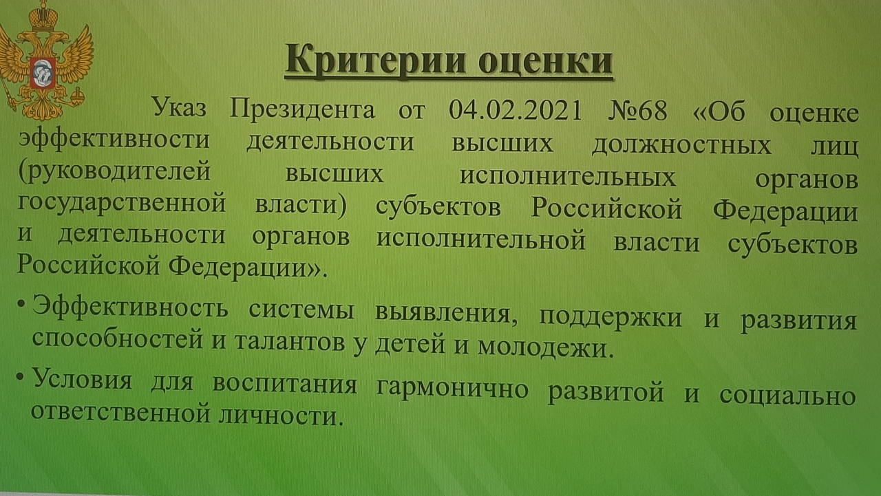Перечень включает 20 показателей для оценки эффективности деятельности губернаторов и органов исполнительной власти субъектов РФ. 2 из 20 критериев оценки усиливают взаимосвязь с Конституцией и поставленными задачами Президента. Применительно к теме дополнительного образования работа в субъекте будет оценена по следующим критериям:
