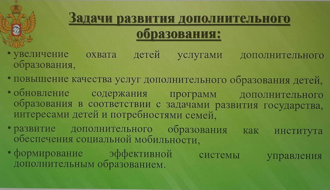 Развитие дополнительного образования имеет особое значение. Необходимо отметить, в 2020 году внесены существенные поправки в Конституцию РФ, главный акцент в решении государственных задач сделан на приоритет защиты детей, создание условий для гармонично развитой личности ребенка: его духовного, интеллектуального и физического развития.