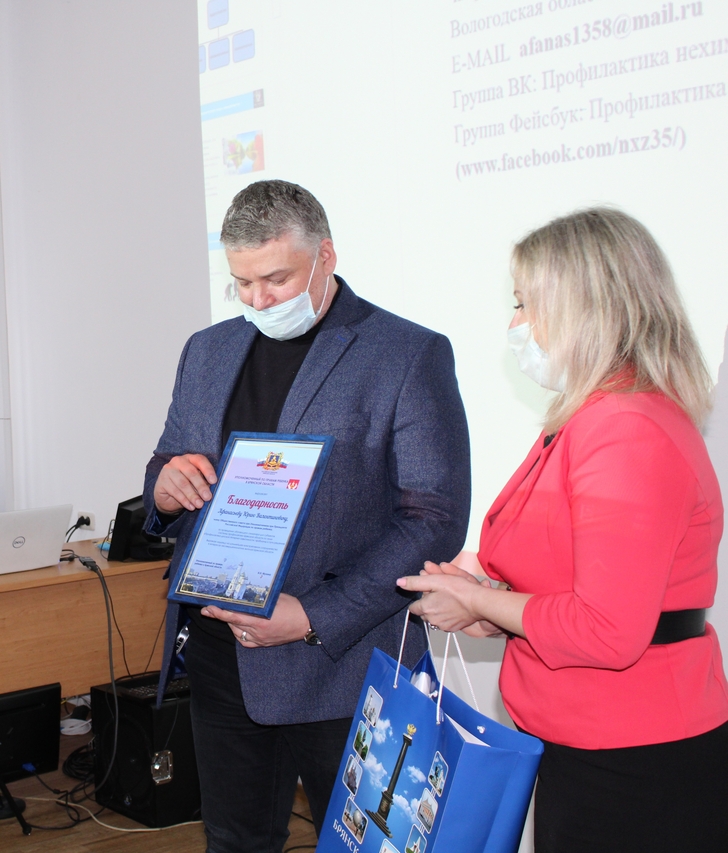 Инна Мухина вручила благодарность Юрию Афанасьеву за представленный практический опыт работы с детьми, в том числе с трудными подростками, и выразила надежду на дальнейшее сотрудничество в интересах несовершеннолетних жителей региона!