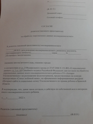 в соответствии со ст. 9 Федерального закона от 27.07.2006 N 152-ФЗ «О персональных данных», п. 1 ст. 64 Семейного кодекса Российской Федерации даю согласие на обработку персональных данных моего несовершеннолетнего ребенка в ГО «Аппарат Уполномоченных» на размещение видеоматериалов, предоставленных на конкурс видеороликов «Стихи любимой маме», на официальных информационных ресурсах (Интернет-сайте и социальных сетях) Уполномоченного по правам ребенка в Брянской области.