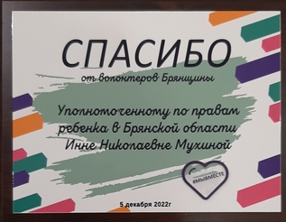 Благодарностью Уполномоченного по правам ребенка в Брянской области за активную жизненную позицию при оказании помощи детям-инвалидам с целью их социализации и адаптации в обществе награждены: