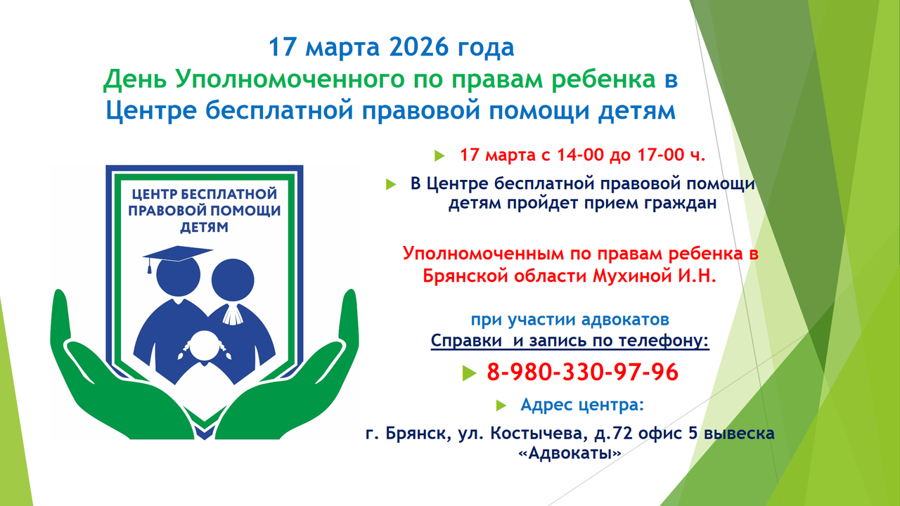 Анонс личного приема граждан Уполномоченным по правам ребенка в Центре бесплатной правовой помощи детям