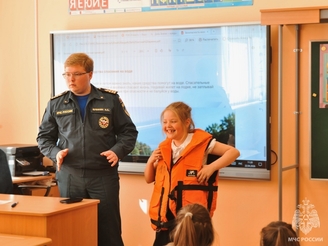Урок был организован в интерактивной форме. Сотрудники МЧС России рассказали детям о правилах поведения при пожаре и задымлении, а также о мерах предосторожности на воде в летний период. Ученики 1 «А» класса смогли примерить боевую одежду пожарного, спасательный жилет, а также получили полезные памятки о безопасности.